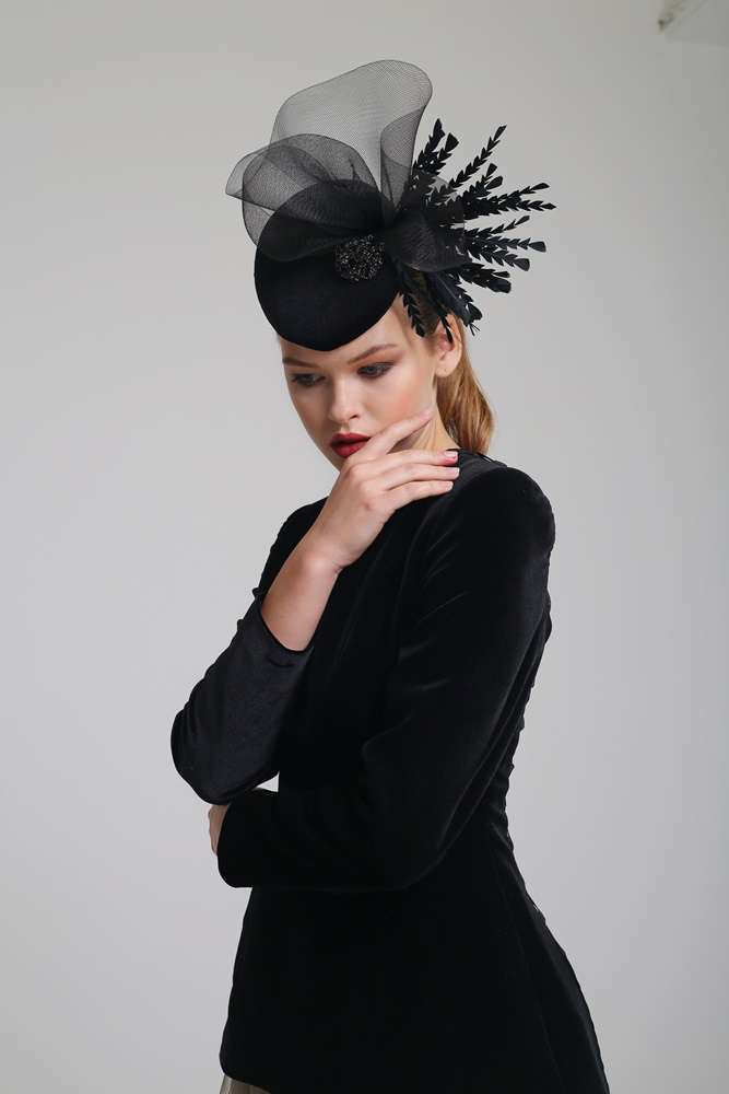 Siyah kadife şapka ile birlikte siyah tüyler, tül ve boncuk şeritlerden bir düğüm ile sonlandırılmış asil bir aksesuar.