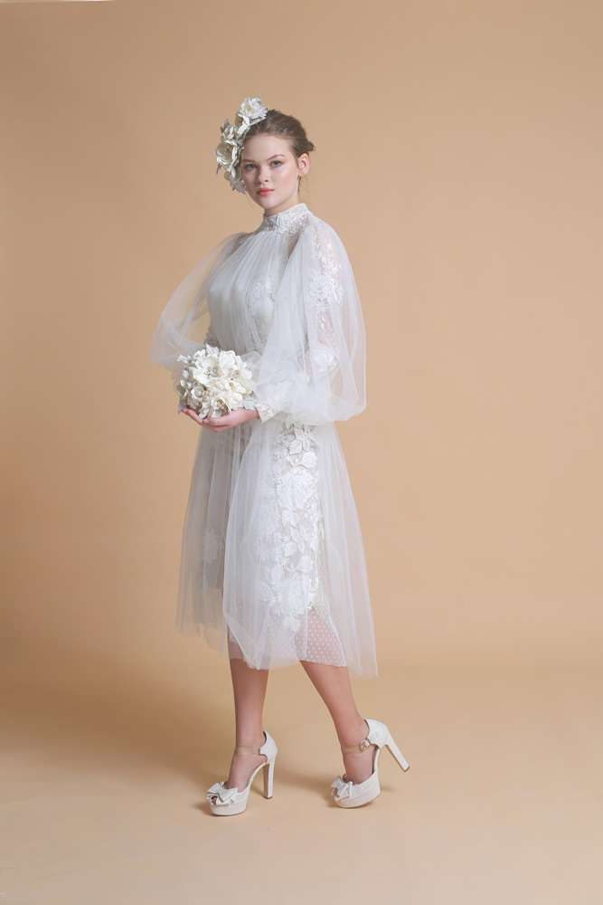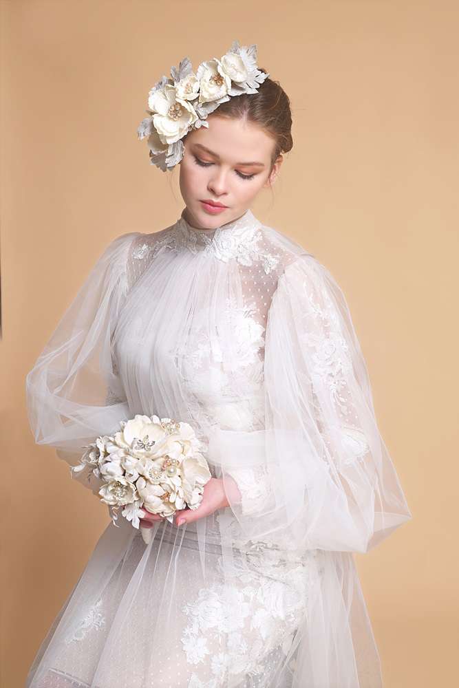 İpek kadife kumaştan, tamamen el işçiliği ile tasarlanmış çok zarif bir gelin buketi. İnci ve kristal taşlarla kombinlenmiş, uçuk çağla yeşili yapraklarla tamamlanmıştır.
